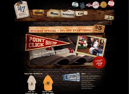 Pakaian olahraga merek premium '47 memiliki sejarah yang menarik: "Ini adalah sebuah cerita klasik. Ini adalah impian Amerika datang untuk hidup ... "Dengan demikian, perusahaan menekankan individualitas merek dalam desain toko dan asosiasi bahwa merek dengan masyarakat. Website menggabungkan jQuery dan Flash, yang memperlambat kecepatan loading, tetapi mengingat tujuannya, ini tidak kritis. Visualisasi kreatif dan mekanisme belanja diimplementasikan dengan baik membuat untuk desain e-commerce yang indah.